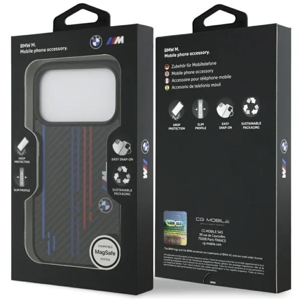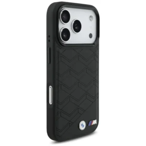 De BMW BMHMP17L25CFSTSK M Kevlar Lines & Logo MagSafe Case voor iPhone 17 Pro in zwart is een premium hoes die geavanceerde bescherming combineert met een sportief design