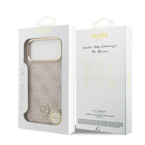 Luxueuze MagSafe-hardcase van GUESS in stijlvol roze, vervaardigd uit hoogwaardig PU-materiaal en versierd met een fonkelend 4G Strass-logo. Deze case biedt betrouwbare bescherming tegen krassen en stoten, terwijl je iPhone 17 Pro Max een glamoureuze en modieuze uitstraling krijgt. Dankzij de MagSafe-ondersteuning is draadloos opladen eenvoudig en perfect compatibel met MagSafe-accessoires.